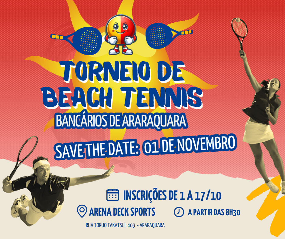 O Sindicato dos Bancários de Araraquara e Região vai agitar as quadras de areia com o Torneio de Beach Tennis, que acontece no dia 01 de Novembro, na Arena Deck Sports (Rua Tokuo Takatsui, nº 409 – Araraquara). Um dia inteiro para suar a camisa, dar boas risadas e aproveitar o clima descontraído desse esporte que vem conquistando cada vez mais adeptos.
