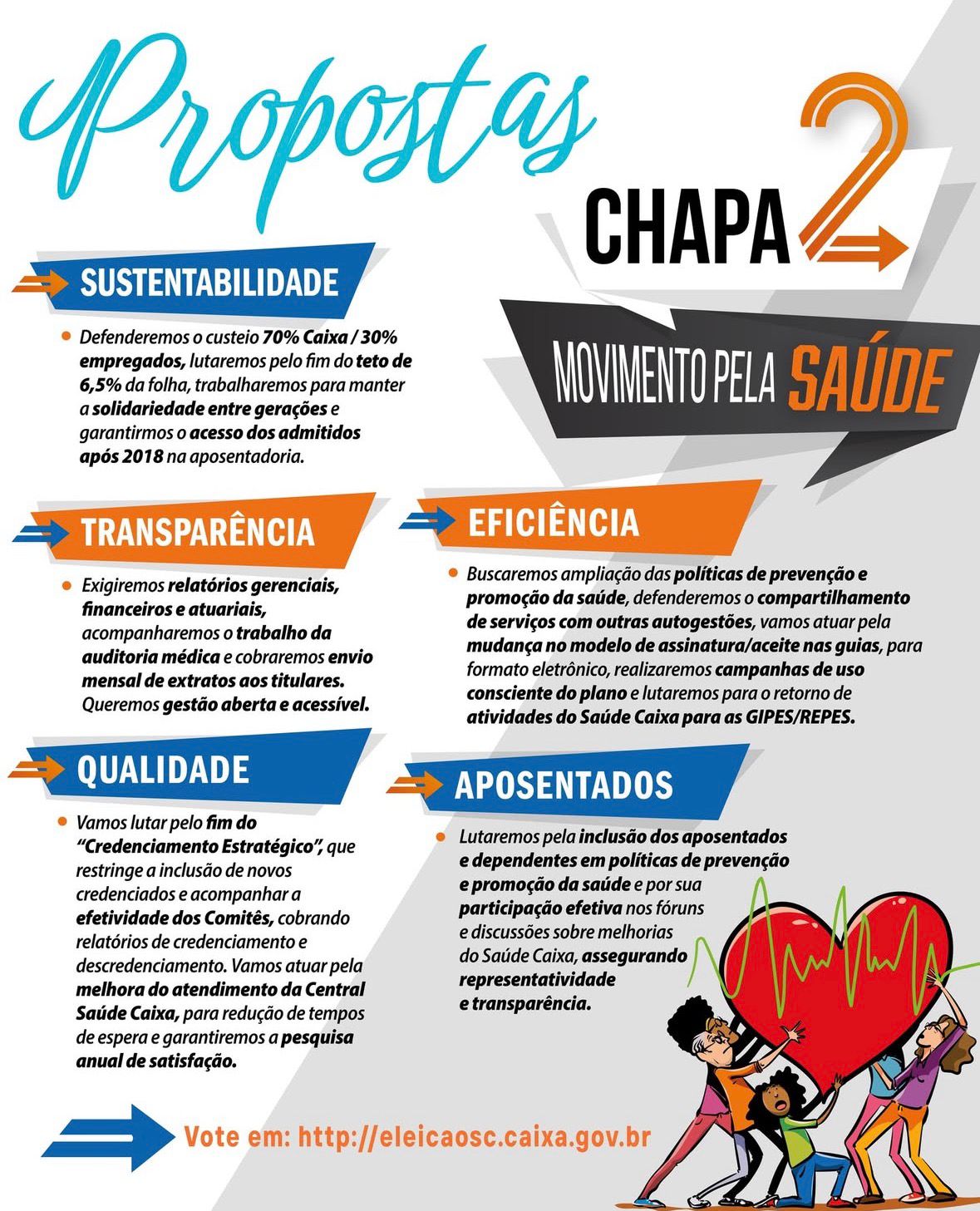 “Nosso plano é de autogestão. O Conselho de Usuários é fundamental para defender o Saúde Caixa e garantir sua qualidade e sustentabilidade, assim como sua manutenção para todas empregadas e empregados após a aposentadoria. Por isso, é importante que todos votem para elegermos uma chapa preparada e com histórico de luta em defesa dos interesses das empregadas e empregados da ativa e aposentados”, disse o coordenador da Comissão Executiva dos Empregados (CEE) da Caixa, Felipe Pacheco, ao explicar que o Conselho de Usuários é um órgão autônomo de caráter consultivo, criado com a finalidade de oferecer subsídios para que a Caixa aperfeiçoe a gestão do plano. “Apoiamos a Chapa 2 – Movimento Pela Saúde pois seus membros já provaram, na prática que são capazes de lutar pelos interesses dos seus colegas de trabalho”, completou.