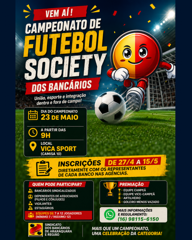 O Sindicato dos Bancários de Araraquara e região abre, a partir desta segunda-feira (27 de abril), as inscrições para mais uma edição do tradicional Campeonato de Futebol Society dos Bancários. A competição será realizada no dia 23 de maio, a partir das 9h, Vica Sport (Camisa 10) e promete movimentar a categoria com muita animação, confraternização e espírito coletivo, dentro e fora de campo.